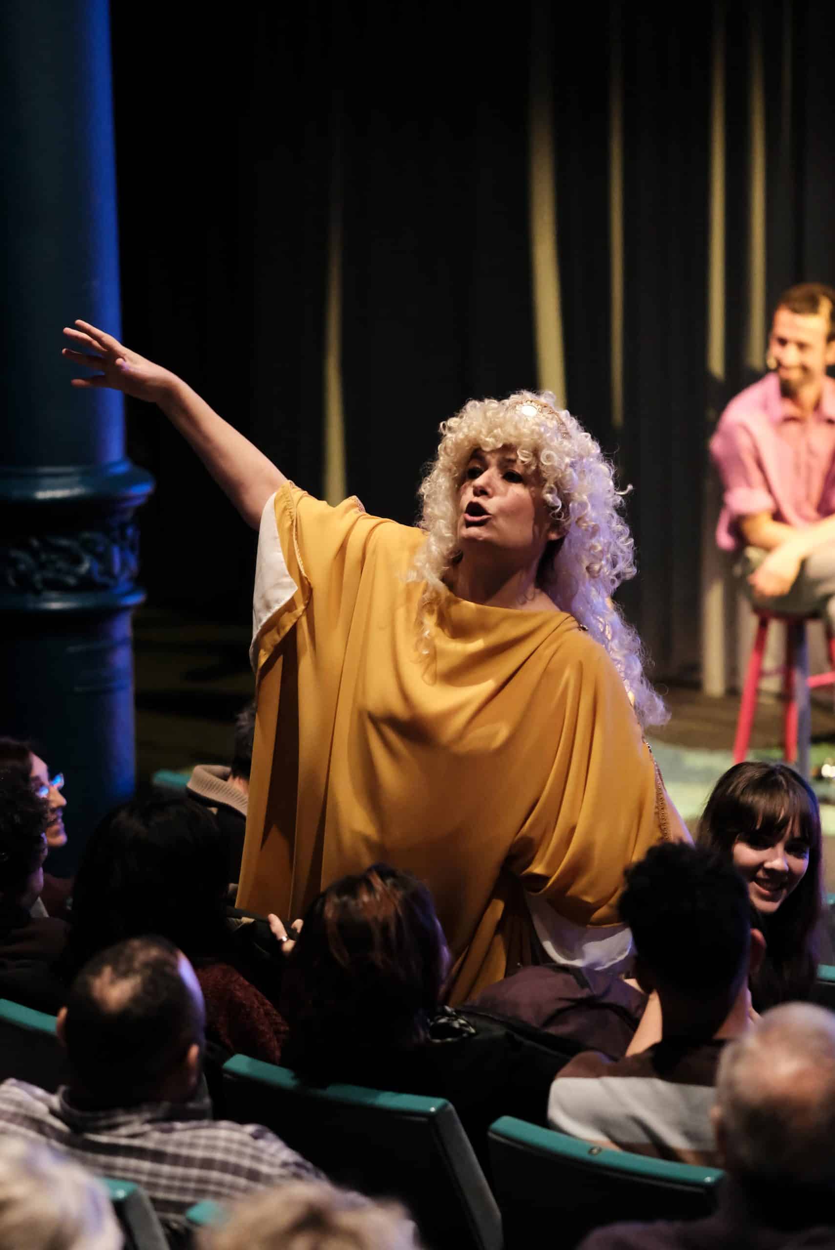 Esta creación está gestada con mucho amor y mucho humor, sello de la productora Hello Yoly. Bienvenidos, bienvenidas al teatro. Esperamos que disfrutéis. Eso está claro, ¿no? Sí, sí. Blanco y en botella.